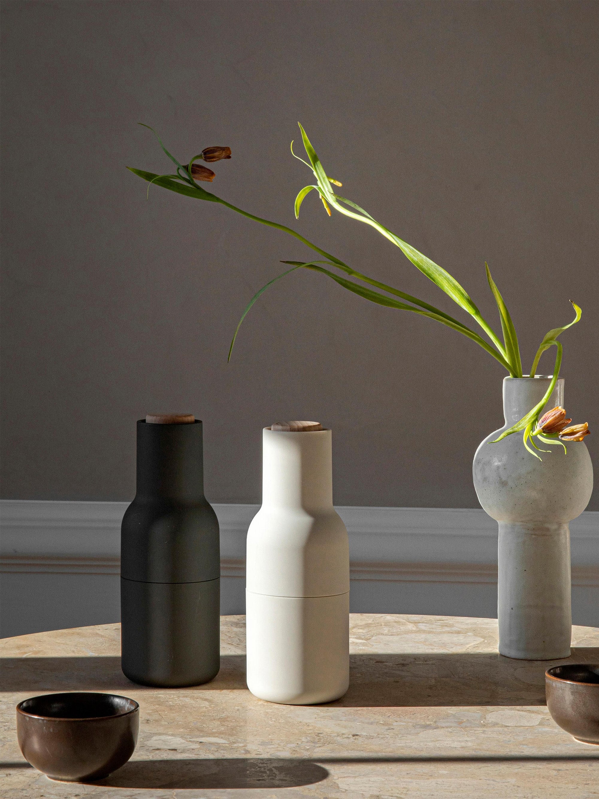 Minimalist beauty: The BOTTLE GRINDER set from Audo Copenhagen includes one salt and one pepper mill, adding design appeal to your table. Plus, the powerful ceramic grinder delivers on the stylish look’s promise.